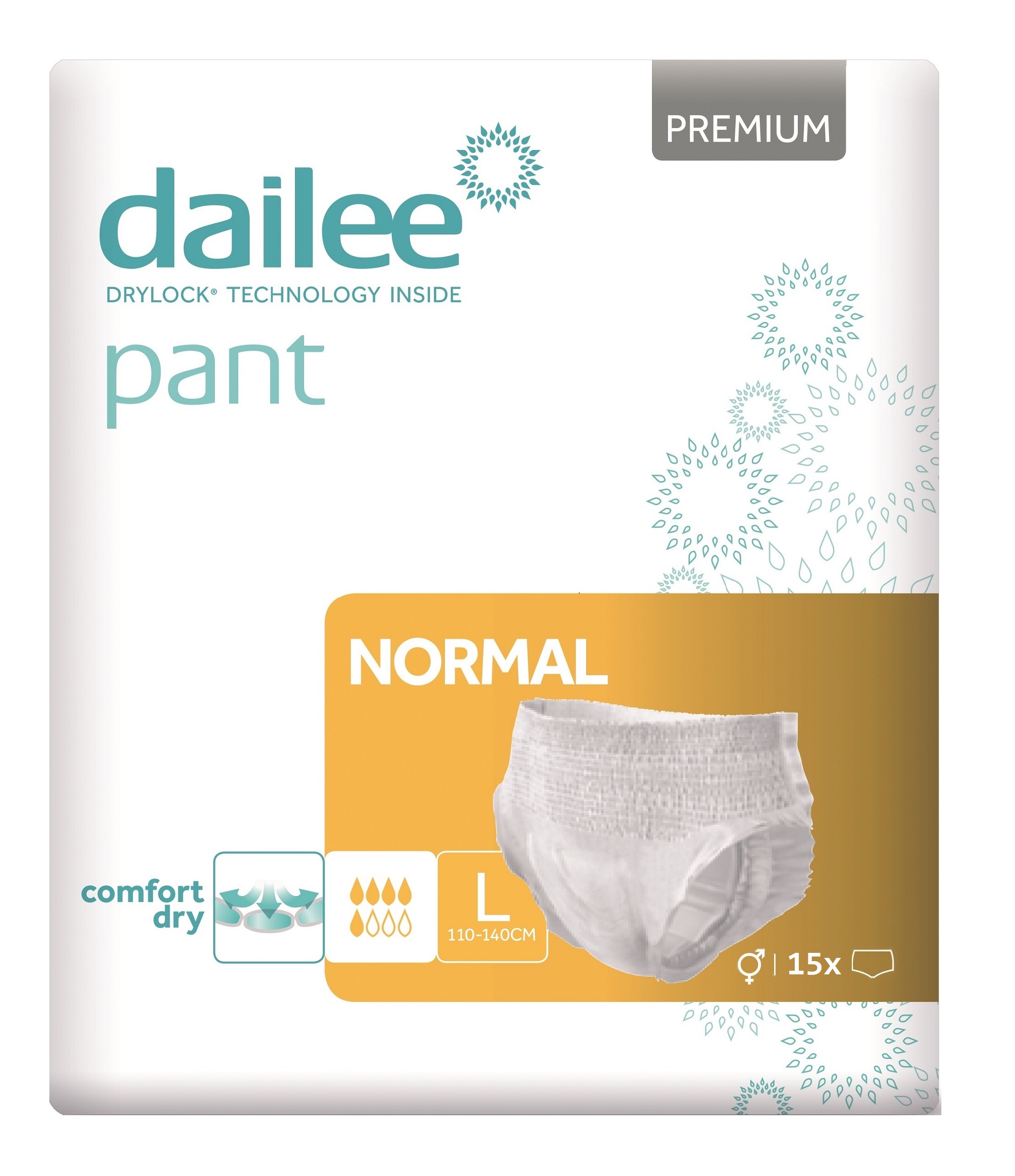 Diskrétní spolehlivé navlékací plenkové kalhotky DAILEE Pant Premium jsou viditelně pohodlné a vysoce účinné díky unikátní technologii DRYLOCK kanálků Comfort Dry. Dermatologicky testované, prodyšné a hedvábně jemné kalhotky s praktickým ukazatelem vlhkosti se lehce přizpůsobí vašemu tělu. Nosí se stejně jako běžné spodní prádlo. Díky materiálu použitému v kalhotkách pro neutralizaci pachů se budete cítit sebevědomě a dokonale v bezpečí i v noci. Všechny výrobky DAILEE mají dokonalou dvojitou ochranu před únikem moči, která zaručuje maximální funkčnost produktu.